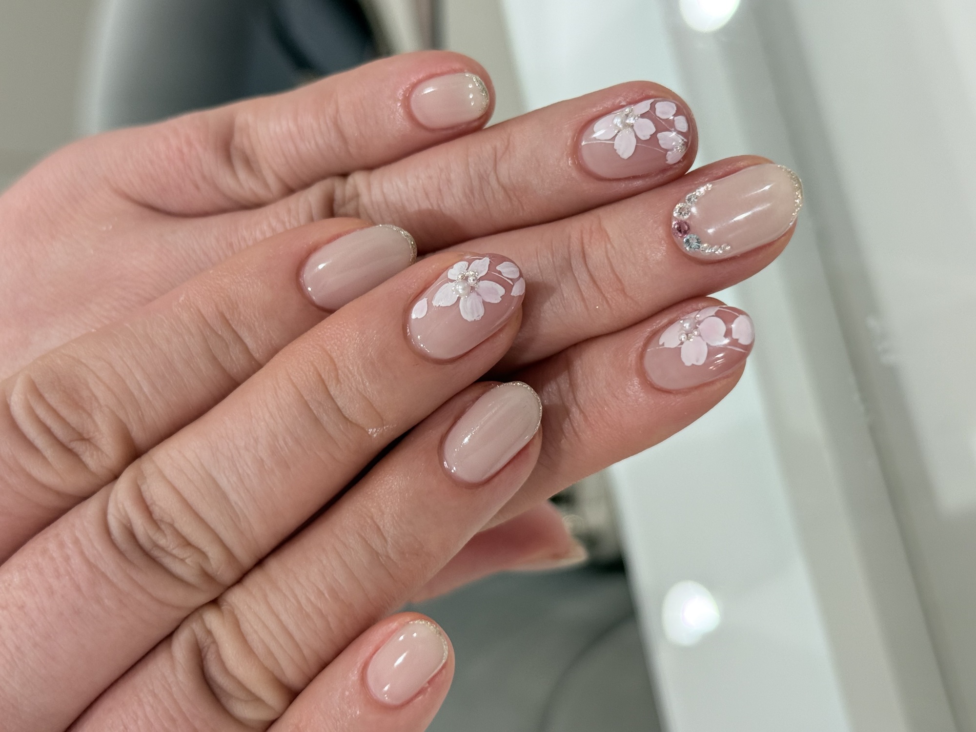シンプル、上品、桜でおまかせネイルとのことでしたので、落ち着いた色味で仕上げました^^