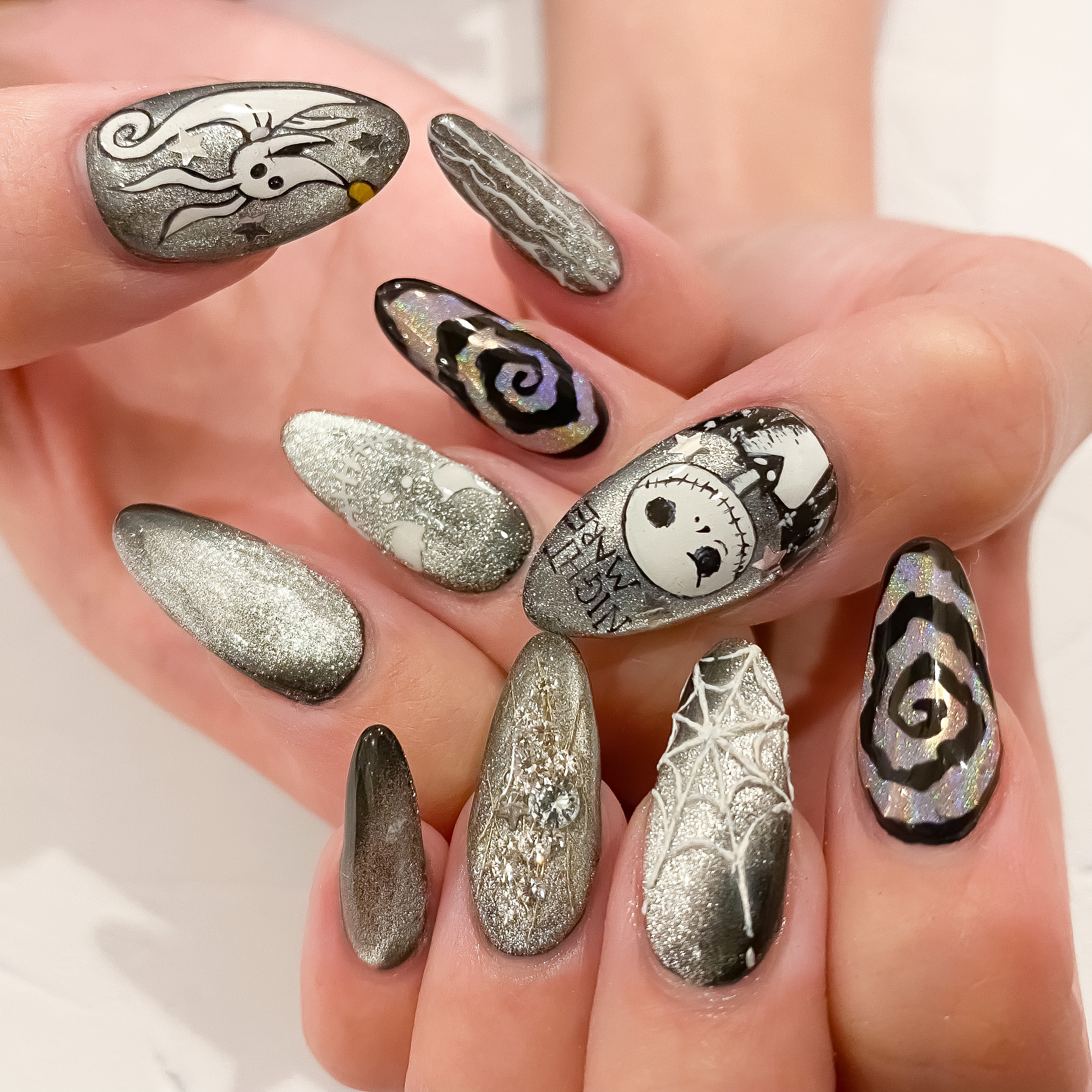 他の指はユニコーンパウダーと、最近流行りのマグネットジェル、スターギャラクシーのシルバーを黒のベースに。