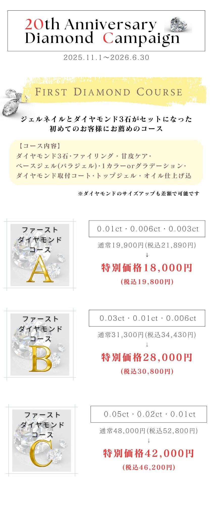 ダイヤモンドの取付とコートには、ダイヤモンド施術料(技術料・ダイヤ紛失補償含)¥2,200、取付料金1石¥220、コート料金1ヶ所¥550かかります。